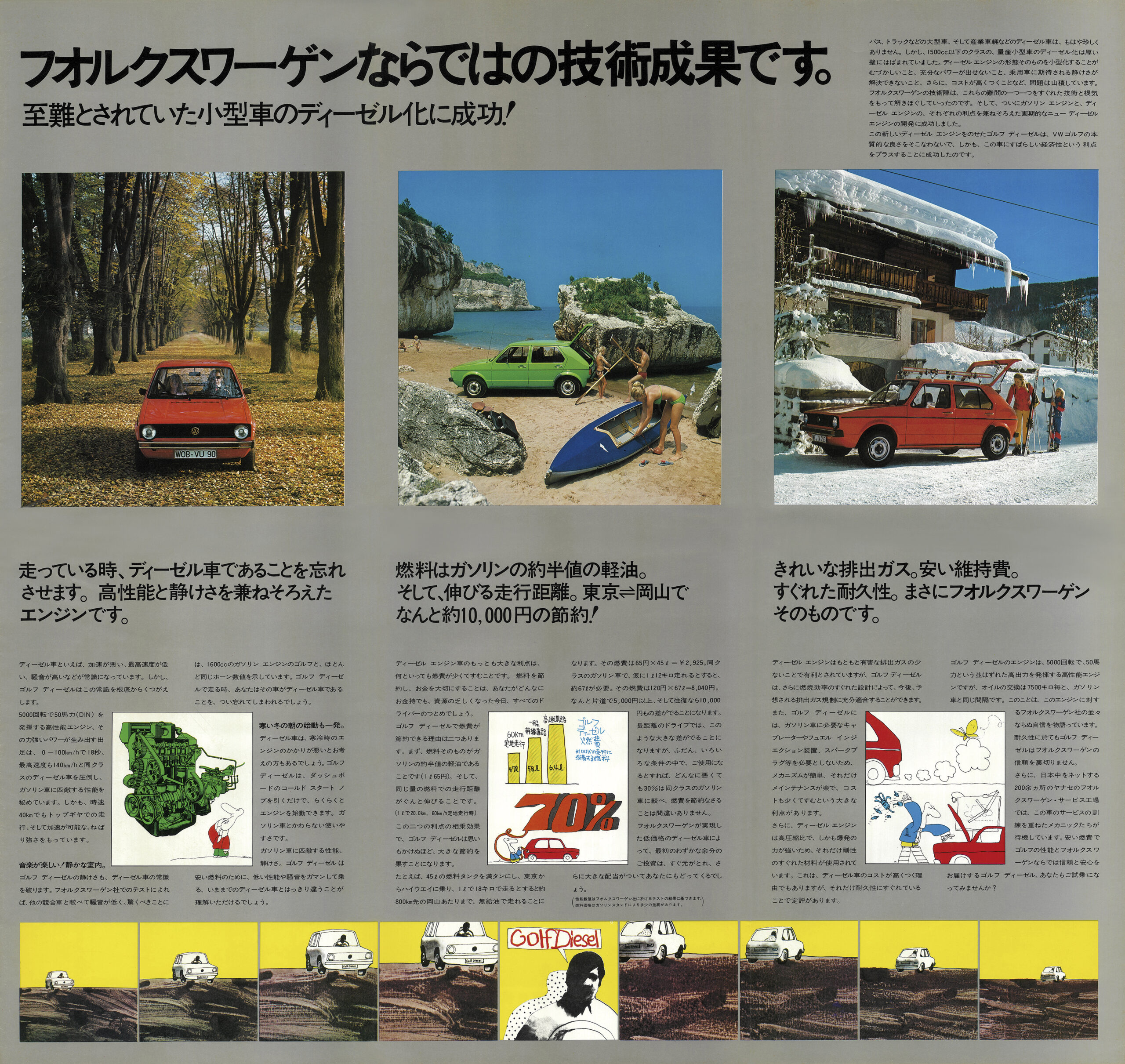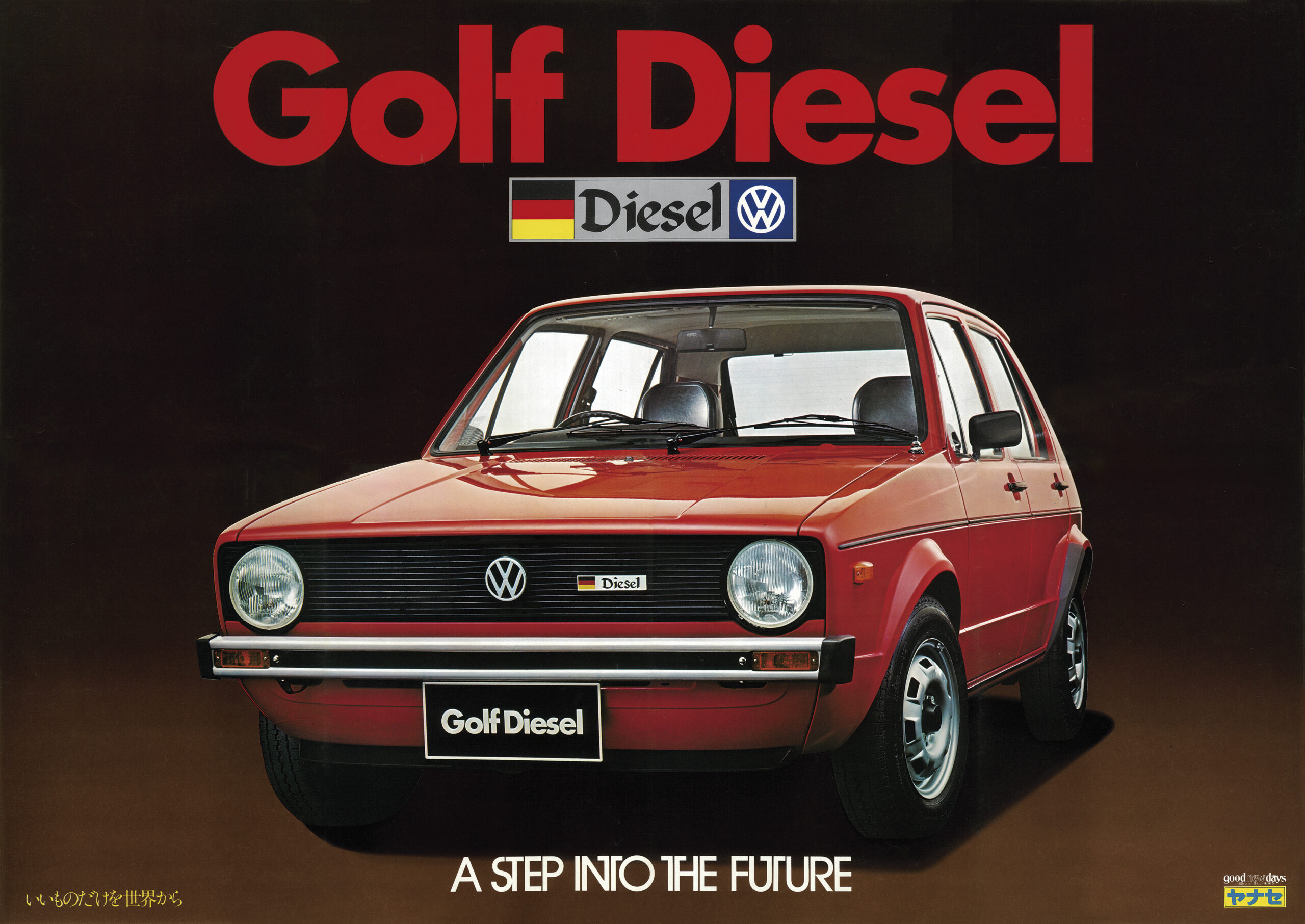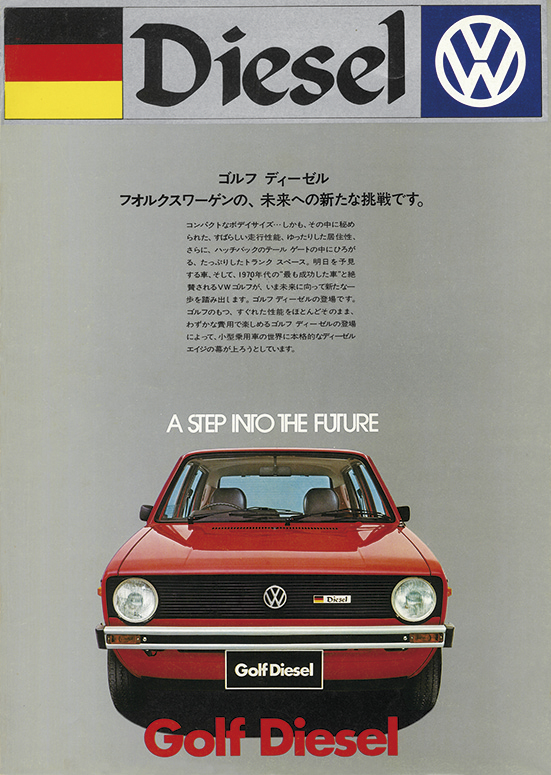 初代VWゴルフD(ディーゼル)の1977年版・日本仕様のカタログ(原寸297×212mm、8つ折り編集)。初代VWゴルフは1974年に欧州で発売されたVWビートルの実質的な後継車。世界中で大ヒット作となり680万台を超えるモデルが生産された。デザインとパッケージングはG・ジウジアーロが担当。合理的なFF2BOXレイアウトは、VWゴルフによって世界標準となった。経済的なディーゼルは1977年にラインアップに参加。乗用車用ユニットをベースに開発された1470ccの直4OHCディーゼルは50ps/8.8kg・mを発揮。最高出力回転数が5000rpmという高回転型でトップスピードは140km/hをマークした。カタログでは「未来への新たな挑戦。ゴルフの優れた性能を、わずかな費用で楽しめる。小型乗用車の世界に本格的なディーゼルエイジをもたらすクルマ」と紹介していた。日本導入時のラインアップは4ドアのモノグレード。トランスミッションは4速MT。ボディサイズは3725×1610×1410mm。その後、グレードを充実させるとともに1981年には排気量を1.6ℓに拡大。1983年にはターボ仕様のスポーティなGTDも導入された。
