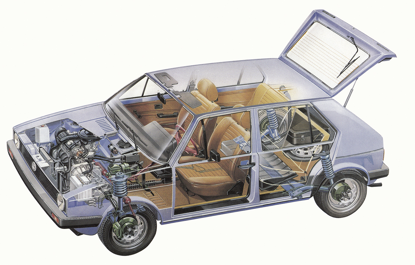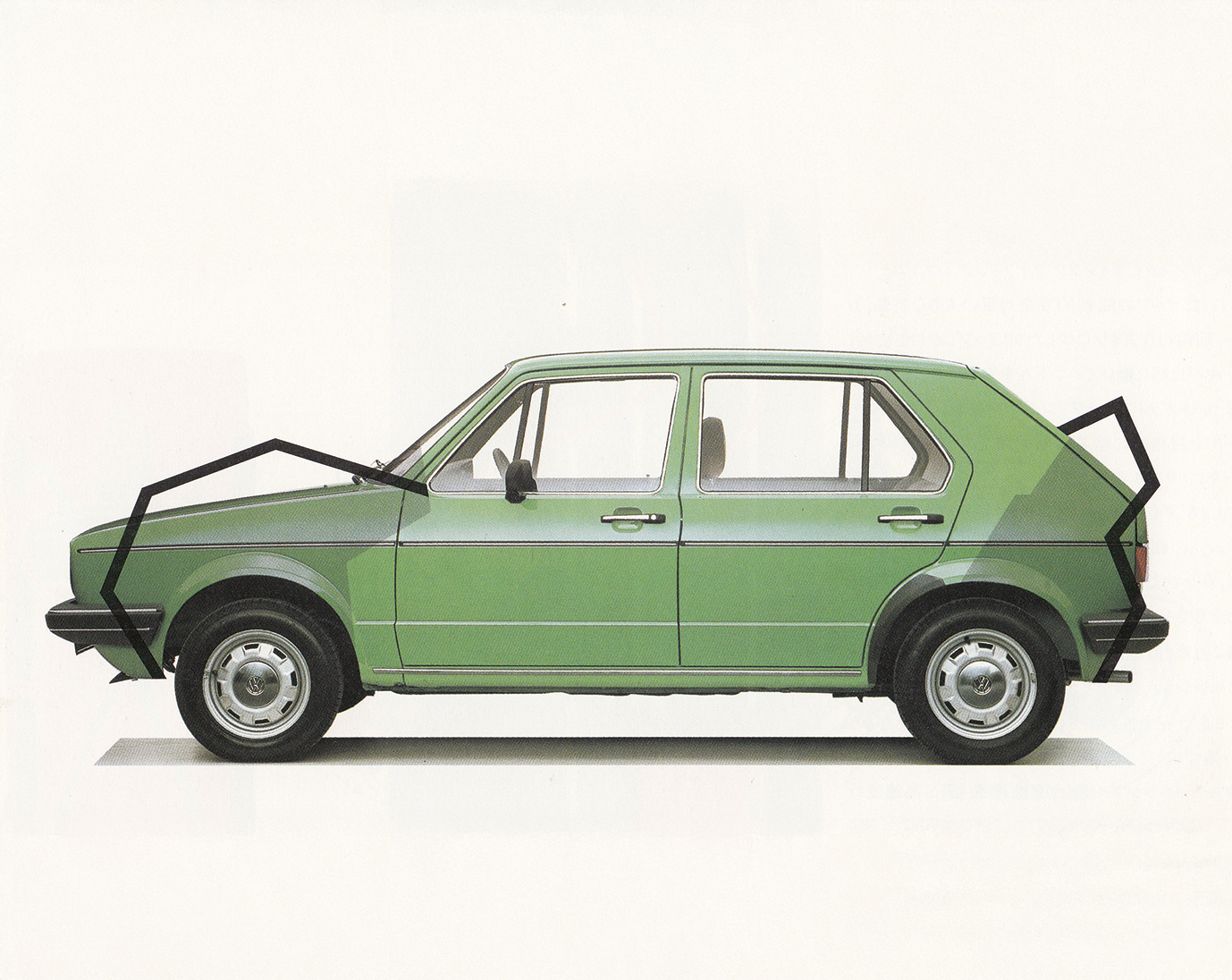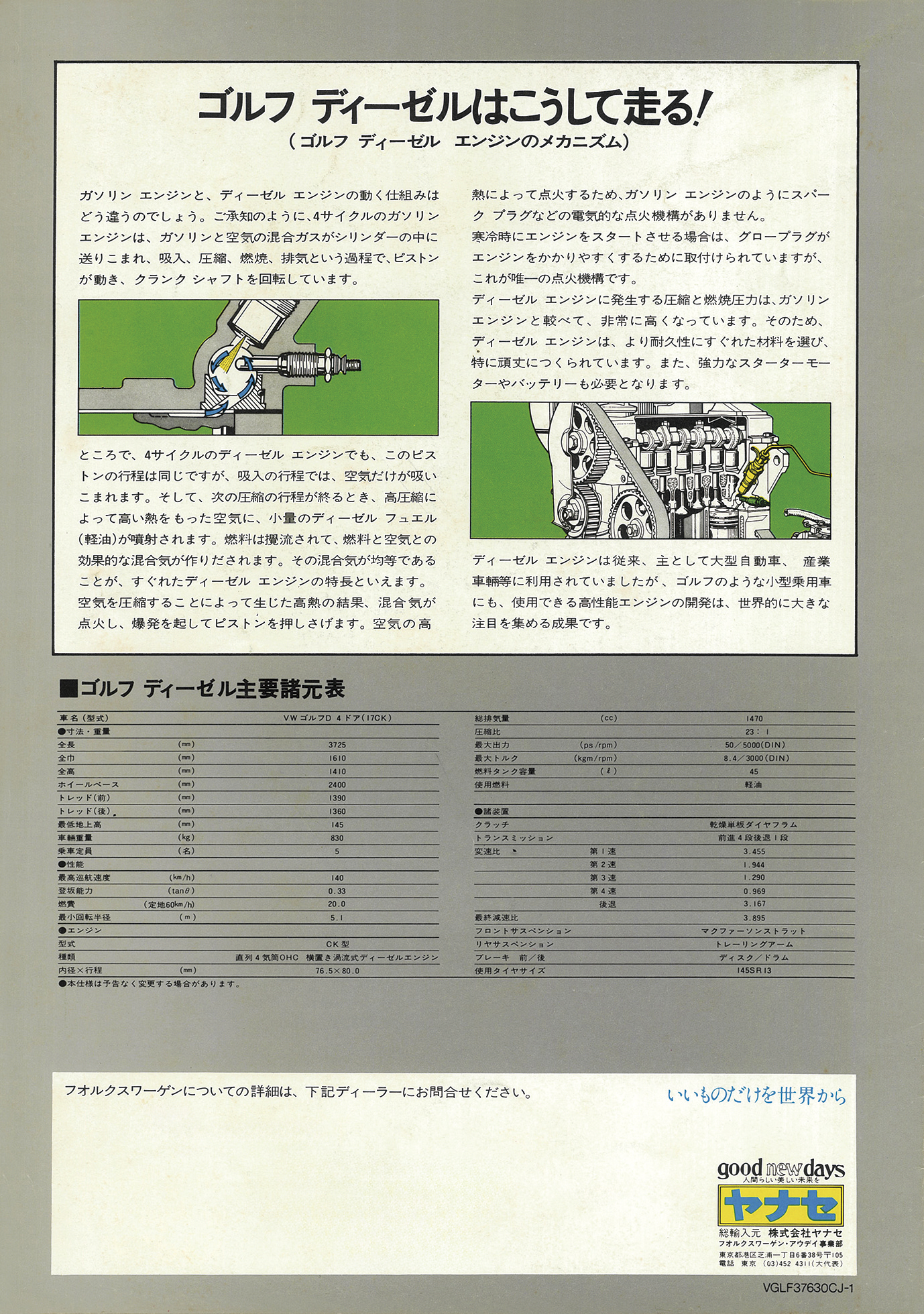 初代VWゴルフD(ディーゼル)の1977年版・日本仕様のカタログ(原寸297×212mm、8つ折り編集)。初代VWゴルフは1974年に欧州で発売されたVWビートルの実質的な後継車。世界中で大ヒット作となり680万台を超えるモデルが生産された。デザインとパッケージングはG・ジウジアーロが担当。合理的なFF2BOXレイアウトは、VWゴルフによって世界標準となった。経済的なディーゼルは1977年にラインアップに参加。乗用車用ユニットをベースに開発された1470ccの直4OHCディーゼルは50ps/8.8kg・mを発揮。最高出力回転数が5000rpmという高回転型でトップスピードは140km/hをマークした。カタログでは「未来への新たな挑戦。ゴルフの優れた性能を、わずかな費用で楽しめる。小型乗用車の世界に本格的なディーゼルエイジをもたらすクルマ」と紹介していた。日本導入時のラインアップは4ドアのモノグレード。トランスミッションは4速MT。ボディサイズは3725×1610×1410mm。その後、グレードを充実させるとともに1981年には排気量を1.6ℓに拡大。1983年にはターボ仕様のスポーティなGTDも導入された。