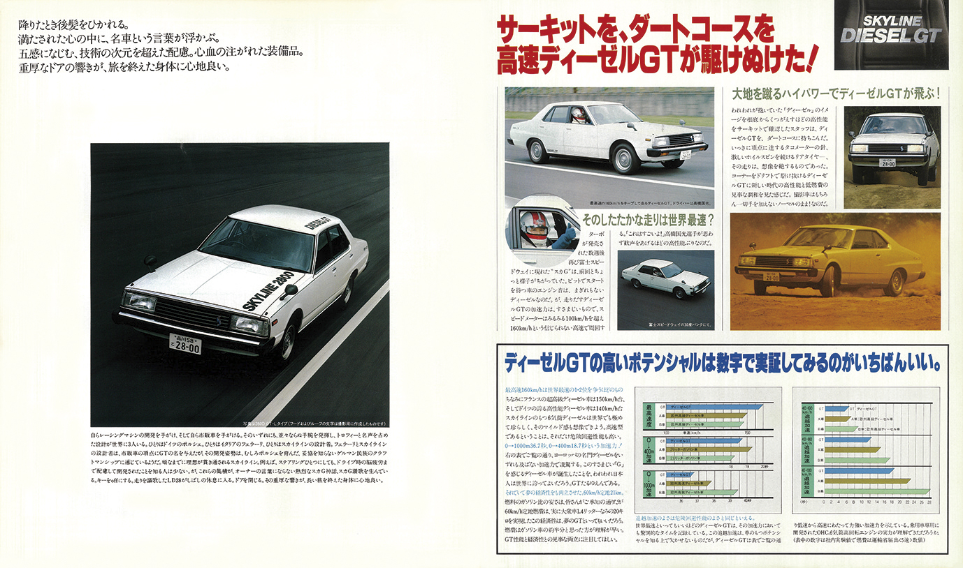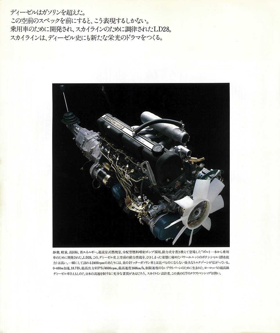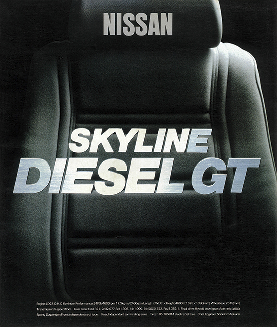 1980年 日産スカイライン・ディーゼルGTのデビュー版カタログ(原寸302×256mm、16㌻編集)。スカイラインのディーゼルGTは、「スカイラインジャパン」の愛称で親しまれた5代目(1977年8月デビュー)に設定。ガソリンターボに続き1980年6月に登場した。パワーユニットは乗用車用に開発され、スカイラインに合わせて調律された6気筒のLD28型。2792ccの排気量から91ps/17.3kg・mを発揮し、トップスピードはディーゼルとしては異例の160km/hに到達し、0→400m加速も18.7秒でクリアー。カタログでは“世界最速を競うディーゼルGT”というキャッチが踊った。
