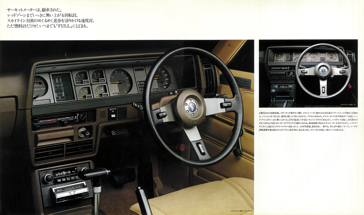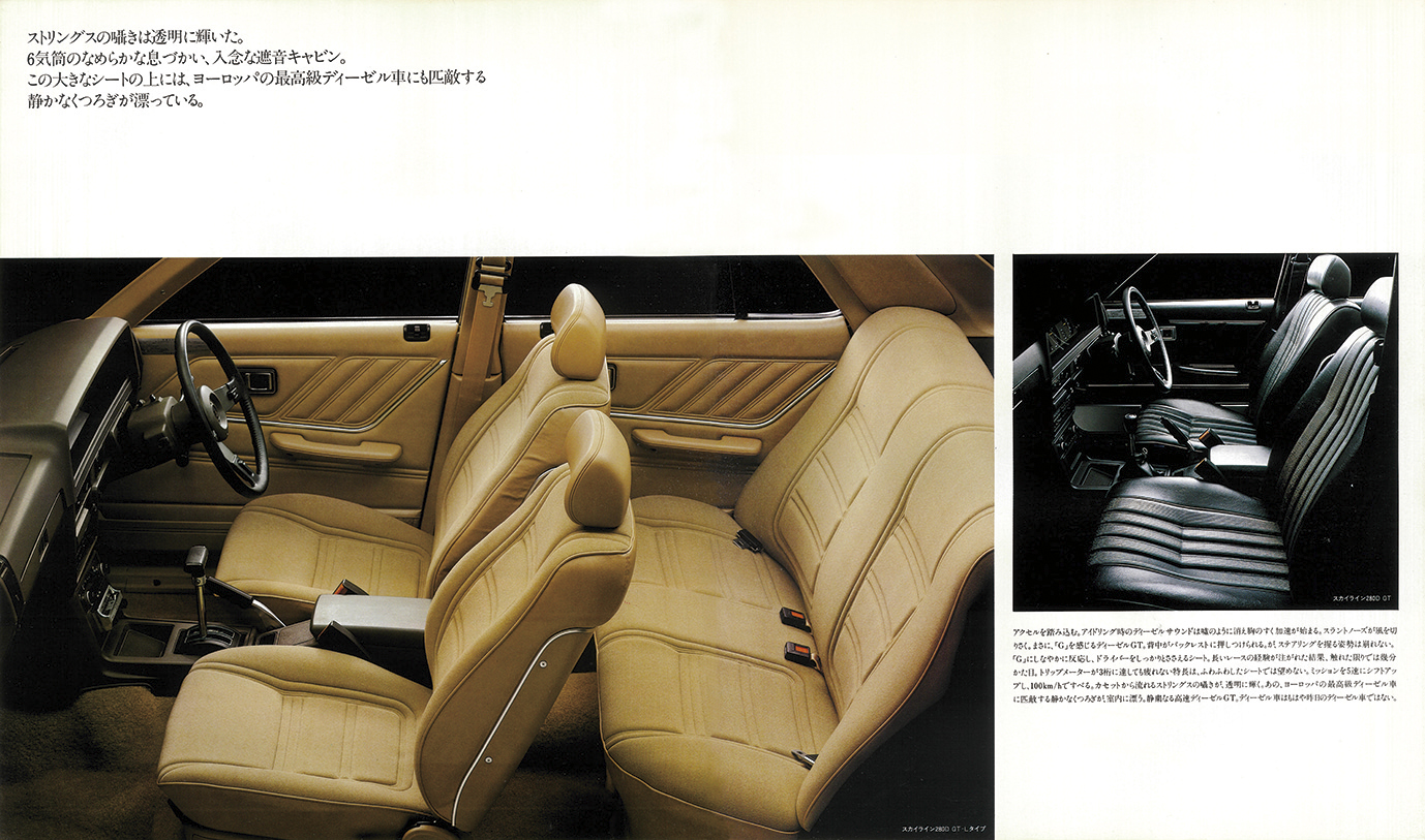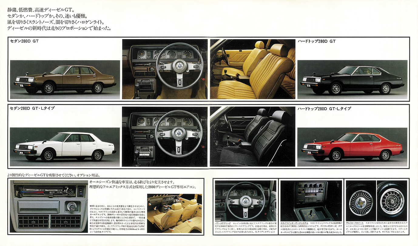 LD28型はまずセドリック/グロリアに搭載(1980年2月)され高評価を獲得。より軽量でスポーティなスカイラインでは“パフォーマンス”に的を絞った味付けが施されていた。ラインアップは280D GTと、豪華装備の280D GT-Lの2グレード。ボディは4ドアセダンと2ドアハードトップの2種。ボディサイズは4600×1625×1390mm(セダン)。トランスミッションは5速MTと3速ATから選べた。