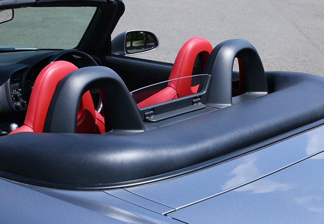ロールバー/シート背後のロールバー中央にウインドディフレクターを装着。オープン走行時の室内への風の巻き込みを抑制