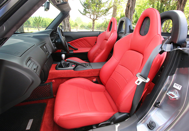 シート/シートはバケット形状。レッドカラーは当時のオプション。着座位置はあくまで低いスポーツ設定。各種操作は手動式