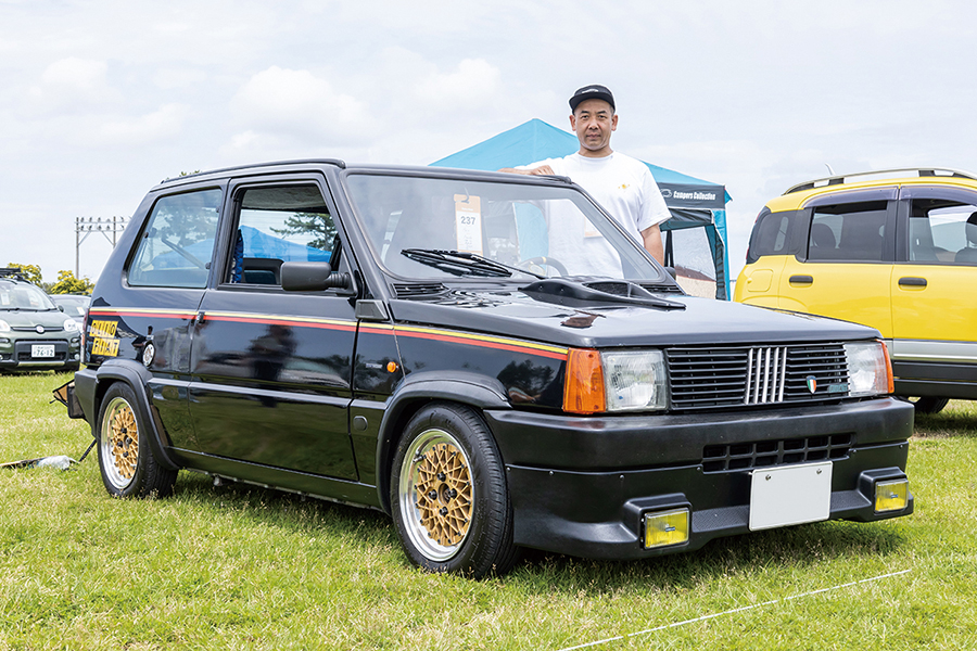 会場を歩くと、歴代で3世代と少なく、スタイリングもシンプルなパンダの印象からは想像できないほどバラエティ豊か。4輪駆動モデルの4×4やスポーツモデル、希少な限定車や並行輸入モデルまでバリエーションは多彩。さらにオーナーたちのさまざまな趣味趣向が反映されている。パンダリーノが維持やカスタムのモチベーションになっているようだ。