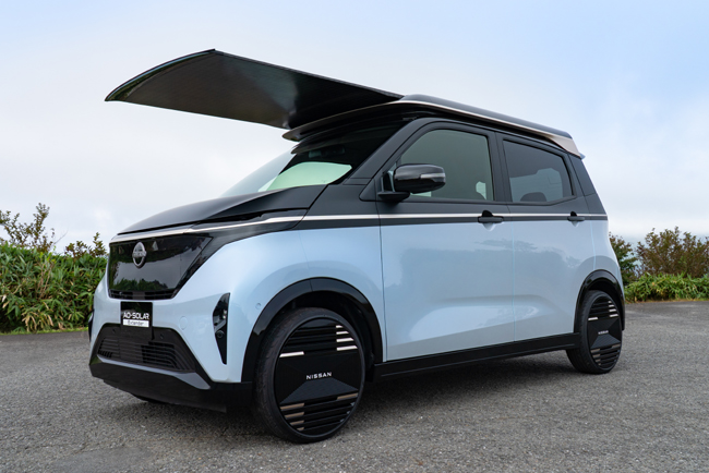 さらに、主催者プログラム「Tokyo Future Tour 2035」のFUTURE CITY LIFEゾーンにおいて、軽EVの日産サクラに車載用電動スライド式ソーラーシステム「Ao-Solar Extender(あおぞら エクステンダー)」を配備したプロトタイプを出展する。ユーザーのEV充電の手間を減らす目的で日産が開発した、電動スライド式ソーラーシステムのAo-Solar Extenderを採用。走行中は車体の屋根に搭載されたメインパネルが最大約300Wの電力を生成し、停車時には収納していた可動パネルが前方にスライドして展開、ソーラーパネルの表面積が拡張して発電能力は合計約500Wに達する。日産では、年間最大約3000km相当の走行に必要な電力を、太陽光発電でまかなうことを目指している。