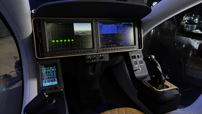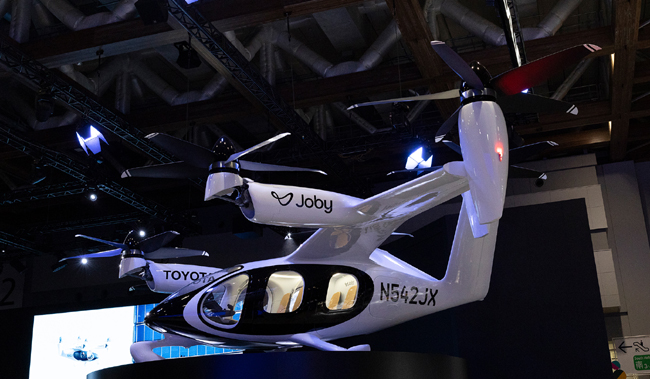 ▲“空”のモビリティとして大型ドローンと小型飛行機の要素を融合した次世代の電動航空機「JOBY」の最新モデルとなる「Joby S4」の実物大モックアップを展示。将来的にはパイロットを必要としない完全自動飛行を目指す