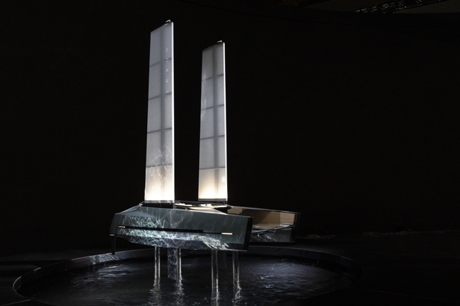 ▲“海”のモビリティとして特別なプライバシー空間とグリッドフリーな航行を実現した「CATAMARAN CONCEPT」の縮小版コンセプトモデルを出展。最上級のプライバシー空間を実現するための機能として自動操船を採用する