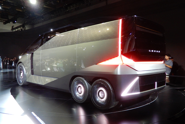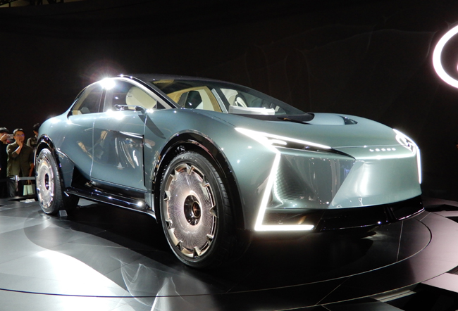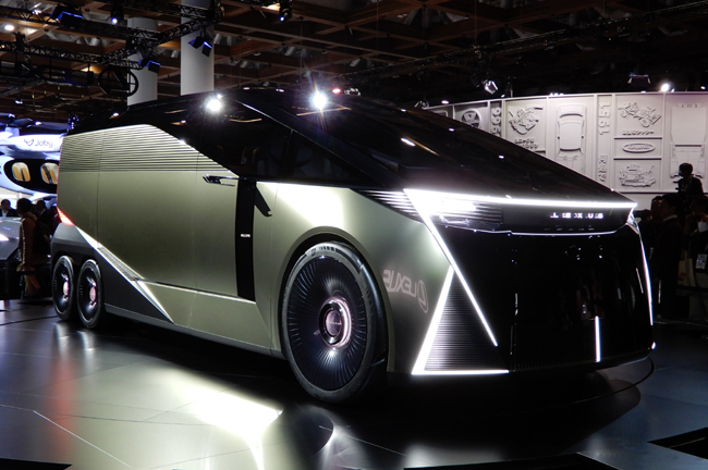 1台目は、レクサス伝統の“誰の真似もしない”姿勢を具現化した、6輪によるパッケージの革新を果たした「LS CONCEPT」。ラグジュアリーセダンでも、ラグジュアリーSUVでもない、ラグジュアリースペースとして登場したLS CONCEPTは、6輪による新たなパッケージングによって、広い室内スペースとスムーズな乗り降りを創出する。6輪にするとリアタイヤが小径化でき、2列目を動かさないと3列目に乗れないという従来のミニバンの欠点を解消。また、プレミアム3列シートらしい乗降性と、広くて快適な後席空間も実現した。シートレイアウト自体はVIPなどが使用するショーファードリブンを意識して、2列目(センター席)を中心に構成。見晴らしが良くてスペースも十分にあり、足を伸ばしても前のシートに当たらない居住性を具現化する。3列目の乗員とのコミュニケーションをスムーズに図れるよう、回転機構も組み込んだ。レクサスの最新デザイン言語を存分に盛り込んだエクステリアデザインや、レクサスのシグネチャーマテリアル“BAMBOO(竹)”を巧みに使って瀟洒に仕立てたキャビン空間のアレンジも、LS CONCEPTのアピールポイントである。