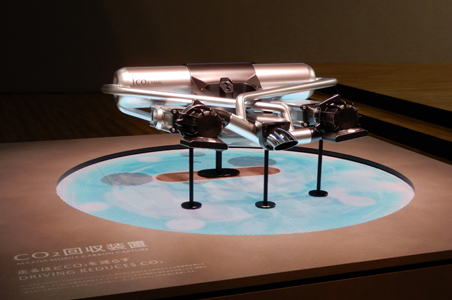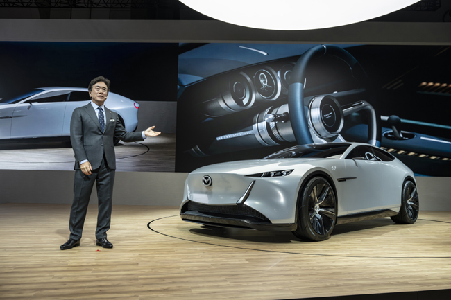ショーの舞台には、毛籠勝弘代表取締役社長兼CEOが登壇。今回の出展テーマ「走る歓びは、地球を笑顔にする」について、「マツダの原点であり、これからの挑戦のコアでもある」と解説。そして、「人が自らハンドルを握り、気持ちよくクルマを運転する歓びを追求してきたマツダは、マルチソリューションで時代に適合し、この“走る歓び”を進化させ、ユーザーの心を動かし、社会に貢献していく」を表明した。具体的には「走るほどにCO2を減らす」未来を創出していくことを目標に掲げ、そのカギとして微細藻類由来のカーボンニュートラル燃料の使用と、CO2回収技術の確立を実現していくという。また、「クルマが人の意を汲み、意のままに、その可能性を広げてくれる未来」を目指すことも公言。その実現に向けて「人体・感性モデル」の研究に注力し、人がクルマを通してどのように感じ、心を動かすのかを科学的に解明して、「快適な乗り心地」や「思った通りの走り」など、人の感性とクルマを繋ぐモデルの開発に挑戦していくと宣言した。そして、こうしたマツダの未来を象徴するビジョンモデル2台を世界初公開する。