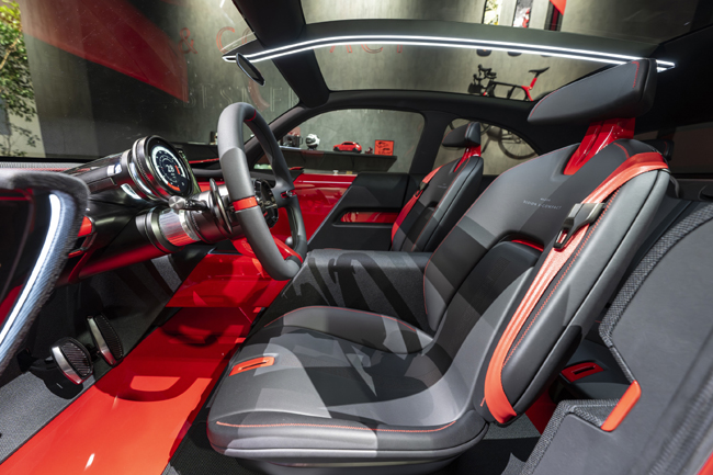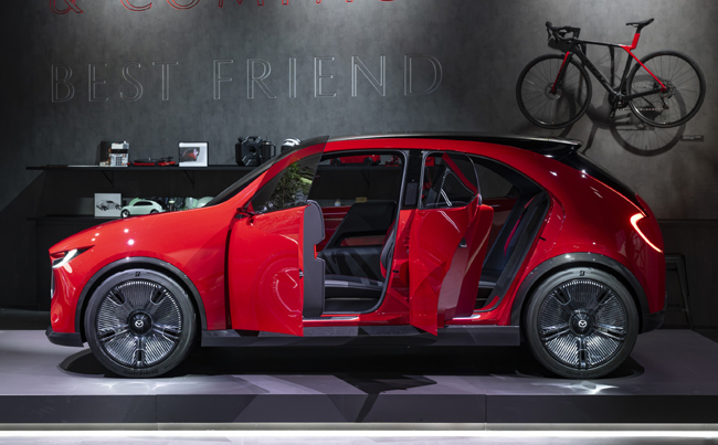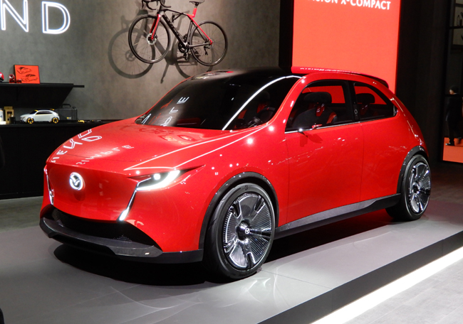 ▲人の感覚をデジタル化した“人体・感性モデル”と共感型AIの融合で人とクルマの絆がさらに深まることを目指した「VISION X COMPACT」。エクステリアはマツダ2の近未来の姿を思わせるアクティブかつスタイリッシュな5ドアハッチバックで構成