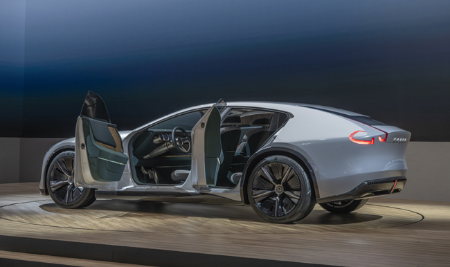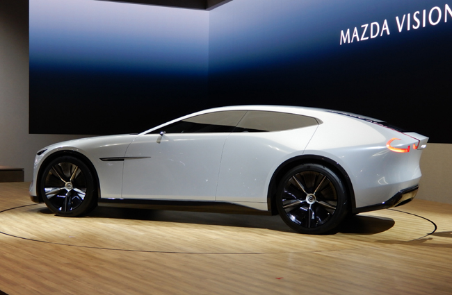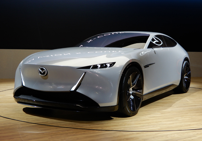 ▲“魂動(こどう)”デザインをさらに進化させたクロスオーバークーペの「VISION X COUPE」がワールドプレミア。パワートレインには2ローター・ロータリーターボエンジンとモーター、バッテリーを組み合わせたプラグインハイブリッドシステムを搭載する
