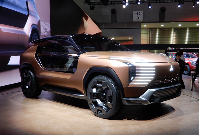 まずコンセプトカーとして、クルマで過ごす時間の上質さを追求した次世代のPHEVクロスオーバーSUV「エレバンス コンセプト」をひな壇に上げる。エクステリアは“Luxe Adventurer”をコンセプトに、滑らかでシームレスなキャビンと引き締まった筋肉質なロアボディで構成し、エレガントさと力強さを併せ持つ近未来のSUVスタイリングを創出する。基本フォルムは高剛性が特長の環状骨格構造であるリブボーンフレームの考え方を取り入れた高い堅牢性を誇るボディがカプセル型キャビンを包み込み、先進的かつ上質でありながら力強さと安心感を備えたスタイリングを演出。また、フロントデザインは三菱自動車のデザインアイデンティティである“ダイナミックシールド”を先進的に表現し、合わせてハニカム形状のフロントグリルとの組み合わせによって洗練された表情の中にも力強さが感じられるマスクに仕立てる。さらに、ヘッドライトからボディサイドのキャラクターライン、そしてリアランプへと直線的に連続する造形により、雄大で堂々としたルックスを具現化した。ボディサイドのウィンドウをキャラクターライン下まで広げることで、移動中に周囲の景色を存分に楽しむことができるようにアレンジした点もトピックである。