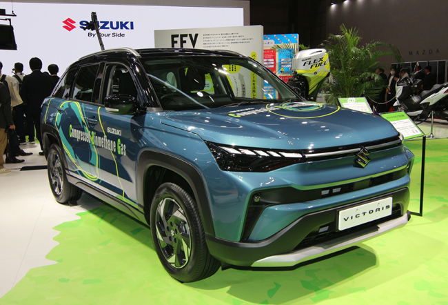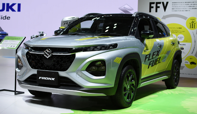 ブースでは、カーボンニュートラル実現に向けたスズキのマルチパスウェイでの取り組みを具現化した動力源を採用する四輪車も注目を集めた。まず、「フロンクスFFVコンセプト」。FFVはFlexible Fuel Vehicle=フレックス燃料車の意で、インジェクターや燃料ポンプ、エンジン制御等を改良して、植物を原料とするバイオエタノール燃料を使用可能とする。従来の化石燃料に比べてCO2削減に貢献しながら、ガソリンの使用も可能となるなど高い利便性を実現したFFVを、スズキはそれぞれの地域にあったカーボンニュートラル実現の選択肢として、拡大展開していくことを表明している。
