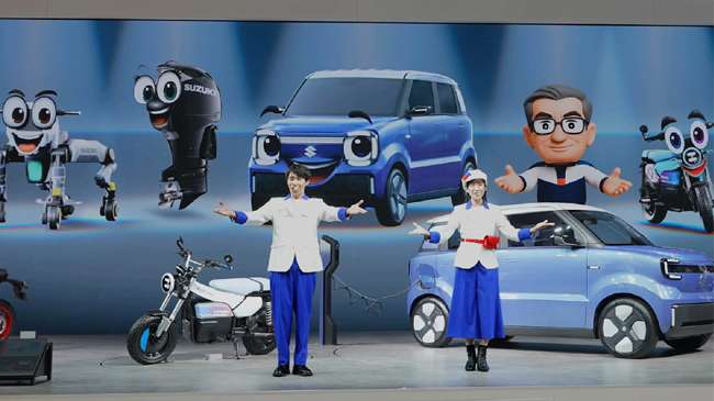 ▲スズキはジャパンモビリティショー2025において「あなたに、ワクワクの、アンサーを。」をテーマに掲げて、軽乗用BEVや二輪BEVのコンセプトモデルなどを出展。セレモニーではアニメ化されたコンセプトモデルや鈴木俊宏代表取締役社長がモニターに映し出される