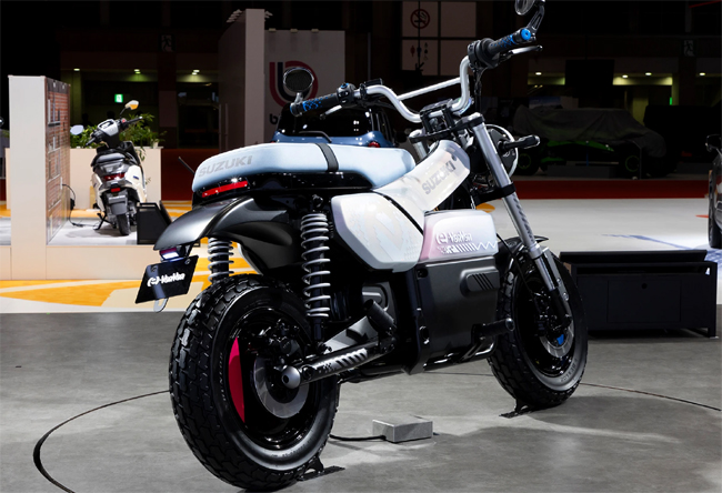Vision e-Skyの横には、二輪車のBEVコンセプトモデルの「e-VanVan」が据えられる。e-VanVanはEVになってもバイクに乗る楽しさ、操るワクワクを感じたいというユーザーの願いを叶えるコンセプトモデルに位置。1970年代より人気を博したスズキのレジャーバイク「VanVan」をモチーフとし、独創的なスタイリングとデジタルテーマのユニークなカラー&グラフィックで先進性を表現して、ファンバイクとしてEVの新たな楽しみ方を提案する。ボディサイズは全長1810×全幅825×全高1050mmに設定。車両区分としては原付二種に相当している。