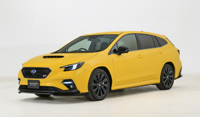 ▲特別仕様車の「LEVORG STI Sport R-Black Limited Ⅱ STI Performance」を展示。新色として設定したサンライズイエローのボディカラーに、ブラックのアクセントパーツを纏う