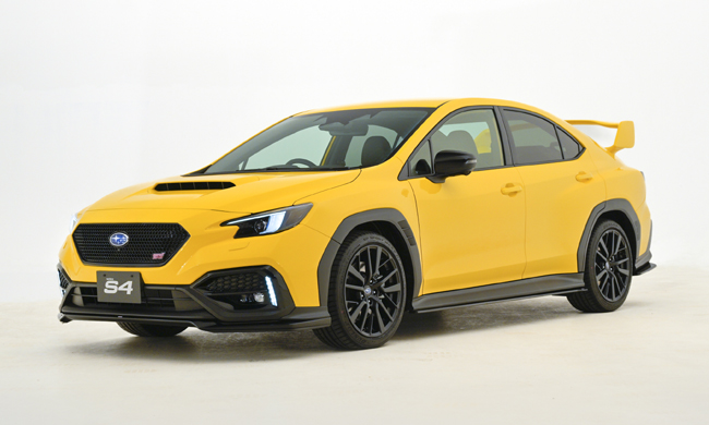 ▲特別仕様車の「WRX S4 STI Sport R-Black Limited Ⅱ STI Performance」を披露。新色のサンライズイエローのボディカラーに、ブラックのアクセントパーツを配備