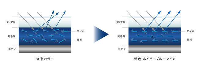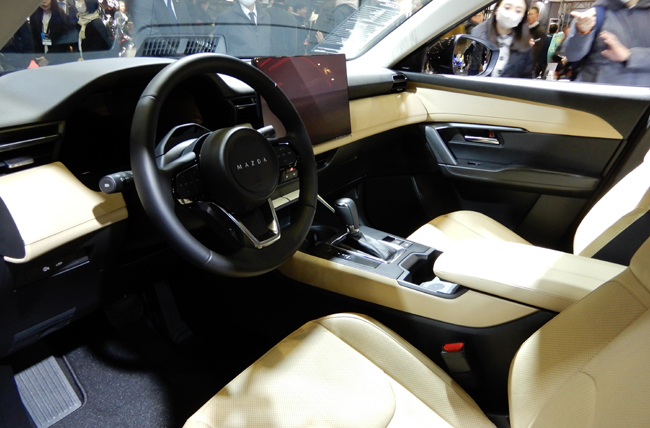 新塗装色のネイビーブルーマイカは、従来のディープクリスタルブルーマイカを進化させたボディカラーで、「明るいところは鮮やかなブルー」に、「暗いところは深く美しいネイビー」に見える表現を目指して開発する。その実現手段として“ハイレゾリューション化(高解像度化)”をテーマに据え、緻密でクリアな色味や質感と明暗差を際立たせる高コントラストを両立するために複数種類のマイカをバランス良く配合した上で、発色層に水平に配置。これにより、晴天や曇天などさまざまな環境でブルーのカラーがクルマの造形をいっそう引き立てるようにアレンジした。なお、ネイビーブルーマイカを纏った展示車の新型CX-5は、19インチダイヤモンドカットデザインアルミホイールなどを装着する欧州仕様のミドルグレードで、日本での一般公開は初。横にはブラック塗装の19インチアルミホイールなどを組み込んだ新型CX-5の旗艦グレードのホムラ(HOMURA)を並べ、グレードの違いも示す。さらに、新型CX-5のホムラは日本初見参のジェットブラックマイカのボディカラーを纏い、合わせてフロントリップスポイラーやルーフスポイラーなどを配備して、スポーティなクロスオーバーSUVのスタイリングを強調していた。