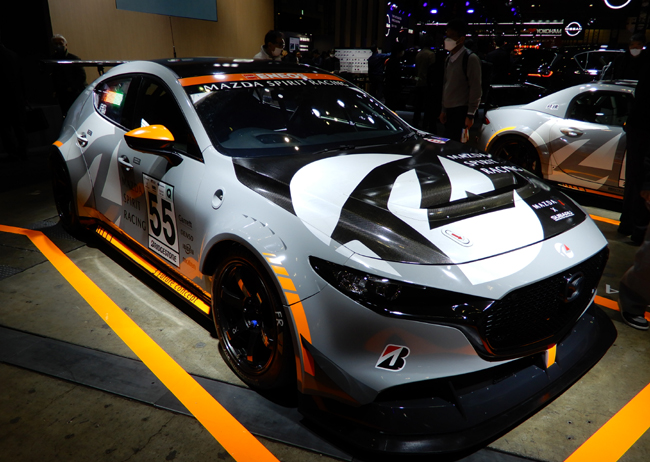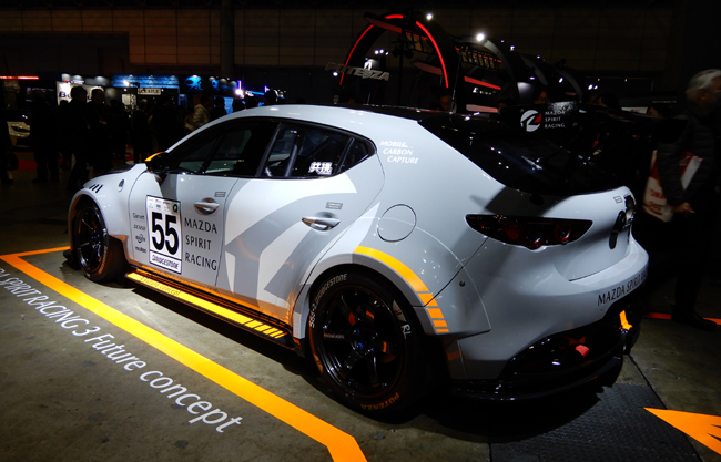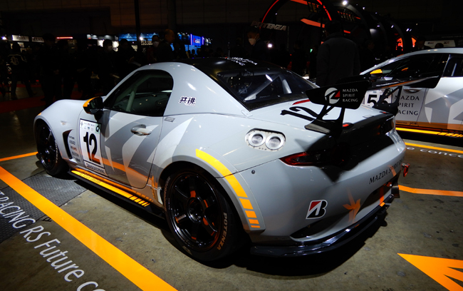 ▲使用燃料に低炭素ガソリン(E20)を採用するとともに、カーボンニュートラルタイヤや再生カーボンパーツなどを装備した「MAZDA SPIRIT RACING RS Future concept(ST-Qクラス・12号車)」を展示
