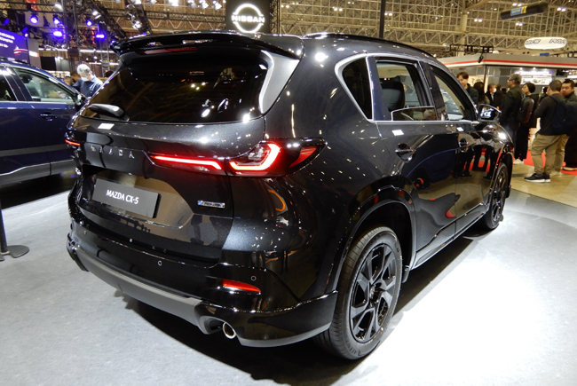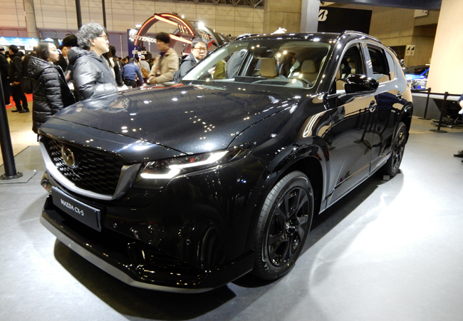 ▲ジェットブラックマイカのボディカラーを配した新型CX-5の旗艦グレードのホムラ(HOMURA)も出展。フロントリップスポイラーやルーフスポイラーなどを装備して、スポーティなクロスオーバーSUVのスタイリングを際立たせる