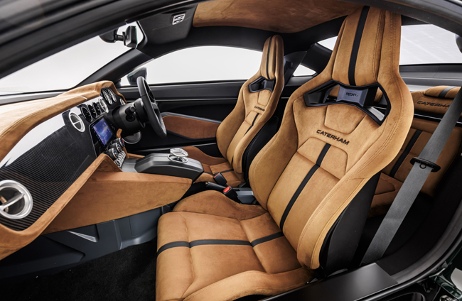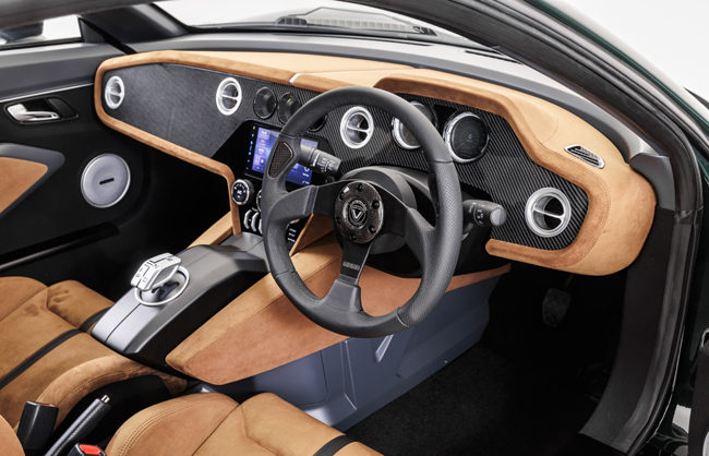 最新プロトタイプは、前回の東京オートサロン2025で披露したホワイトのボディカラーから、英国製スポーツカーらしい深いグリーンに刷新。基本フォルムは従来を踏襲するが、グリルやランプ類、各エアロパーツなどのデザインおよび組み付けは、より完成度を高めている。また、内装は従来の2+1シート構成から2+2シート構成に変更するとともに、瀟洒なタンのインテリアカラーでアレンジ。センター部にはギアレバーを新設(従来はインパネ右に配したスイッチ式)し、ステアリングには新形状の3本スポークタイプを装着した。さらに、今回のショーでは基本骨格に鋼管スペースフレームを採用することを公表。セブンで培った技術が、EVスポーツカーにも踏襲、そして応用される運びとなった。