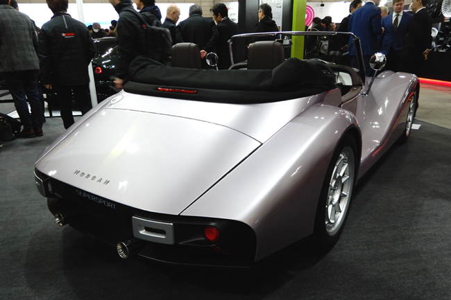 ▲モーガンの新型フラッグシップモデル「スーパースポーツ」を展示。従来のプラットフォームの進化版となるアルミニウム製プラットフォーム「CXV」に、専用チューニングのBMW製3リットル6気筒ターボエンジンにZF製8速ATを組み合わせて搭載する