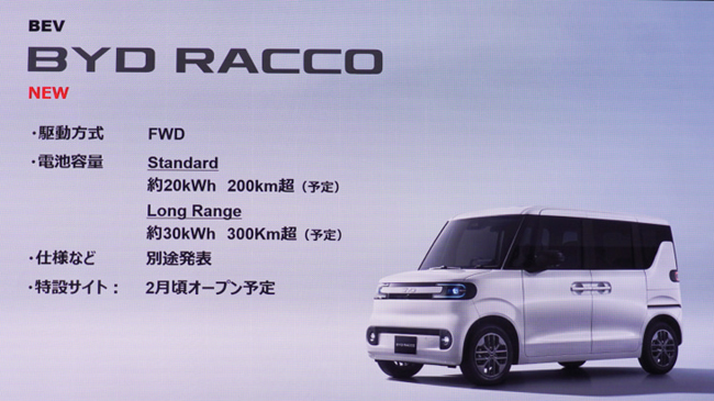2026年内に日本市場に導入する新型車の計画も発表する。まず軽EVの「ラッコ」は、総電力量約20kWhを確保したリチウムイオン電池を搭載して一充電航続距離200km超を実現したスタンダードと、総電力量約30kWhを確保したリチウムイオン電池を搭載して一充電航続距離300km超を実現したロングレンジをラインアップし、2026年夏の日本発売を予告。特設サイトは本年2月ごろに開設する予定である。