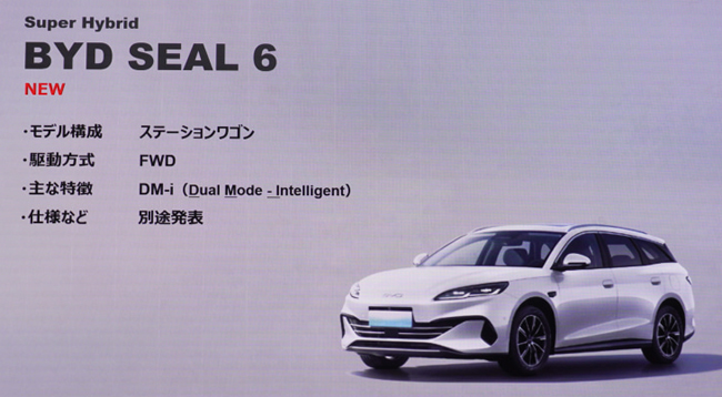 そして、PHEV車の第3弾となるミッドサイズステーションワゴンの「シール6(SEAL6)」。パワートレインには1.5Lガソリンエンジンに高効率モーターとリチウムイオン電池を組み合わせた、BYD独自の電気を主役にしたハイブリッド技術「DM-i」を搭載する。日本発売は2026年末を計画している。