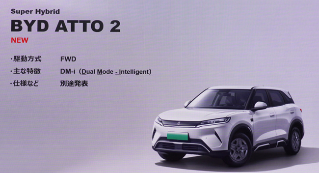 次に、シーライオン6に続く“スーパーハイブリッド(SUPER HYBRID)”のPHEV車となるコンパクトSUVの「アット2(ATTO2)」。パワートレインには1.5Lガソリンエンジンに高効率モーターとリチウムイオン電池を組み合わせた、BYD独自の電気を主役にしたハイブリッド技術「DM-i」を採用する。日本発売は2026年下半期の予定だ。