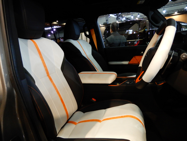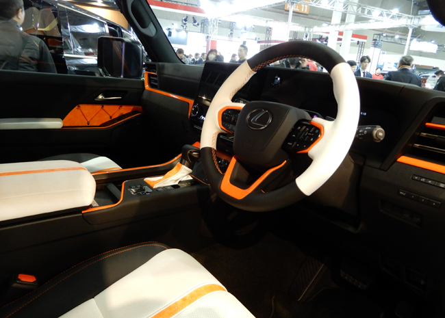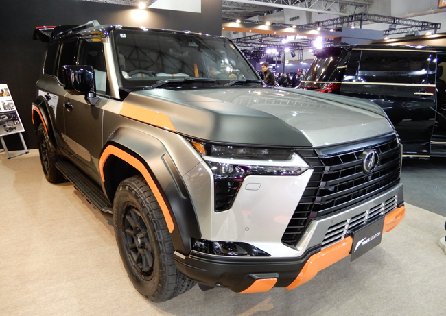 4台目は、自然と調和するラグジュアリーSUVを目指してカスタマイズした「レクサスGX TOM'S EDITION」。「自然と未来をつなぐ新たな一歩を、共に」を開発思想の中核に据え、GX本来の力強さと品格はそのままに、自然と共生する未来志向の価値観を重ね合わせた内外装を採用する。エクステリアは、悪路を駆け抜けるトレイルランニングシューズをモチーフにデザイン。空力特性を高める専用デザインのエアロパーツ類には、視界が制限される森林などでも車両の存在を明確にする目的で、シューズのソールやアクセントカラーに使われる“蛍光オレンジ”を配した。インテリアについても同系色のオレンジを採用して、外観とのトータルコーディネートを図っている。パワートレインの3444cc・V型6気筒DOHCガソリンツインターボエンジンに関しては、現在チューンアップを目指して開発を進めているそうだ。