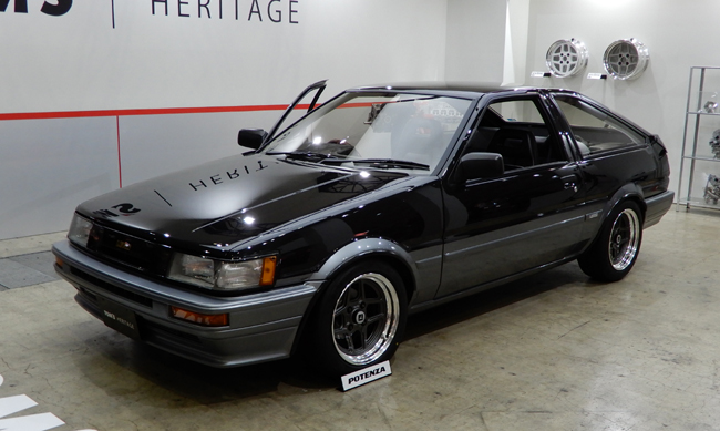 トムスが長年培ってきた技術を未来へ受け継ぎたいという思いから立ち上がったプロジェクト「トムス ヘリテージ」のコーナーでは、「当時の姿のまま、走りだけ現代」で仕上げたレストア+アップデートモデルのAE86型トヨタ カローラ・レビンを披露する。外観はオリジナルの造形を忠実に再現しつつ、トムスが培ってきた空力設計思想をアンダーパネルに投入し、車体全体のエアロバランスを最適化。足もとには、トムスの象徴である井桁ホイールを2ピース構造、7.5JJ×15サイズで復刻して採用する。タイヤには195/50R15 82VサイズのブリヂストンPOTENZA RE-11RSを組み合わせた。一方でインテリアについては、純正シートをベースにウレタンをレストアし、合わせてシート表皮は当時の風合いに合わせた織物素材で新調。シート生地に合わせてドア内張りの一部も張り替えることで、ノーマルらしさを保ちながらも古びた印象を払拭する。さらに、往年のTOM'Sステアリングを装着して時代性とスポーティさを両立させた。