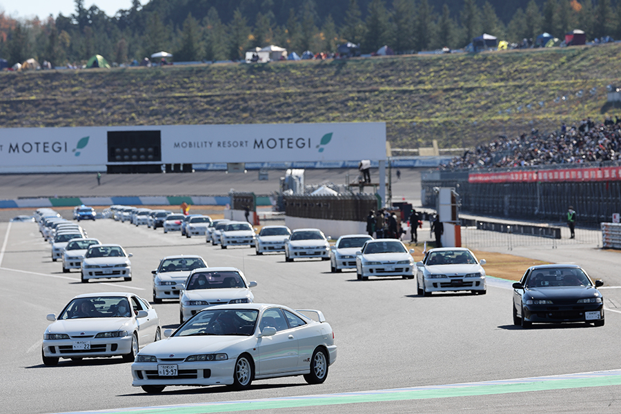 今回はタイプR誕生30周年にちなみ、タイプRに限定したオーナーズパレードを開催。もてぎのオーバルコースを周回した。NSX、インテグラ、シビックなどホンダ・ファンの心を熱くするモデルが5ワイドでスーパースピードウェイの本コースで待機している様子は圧巻だった。