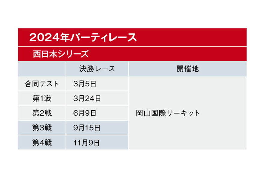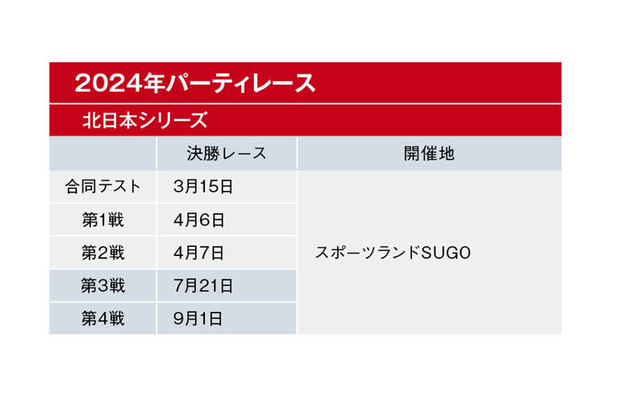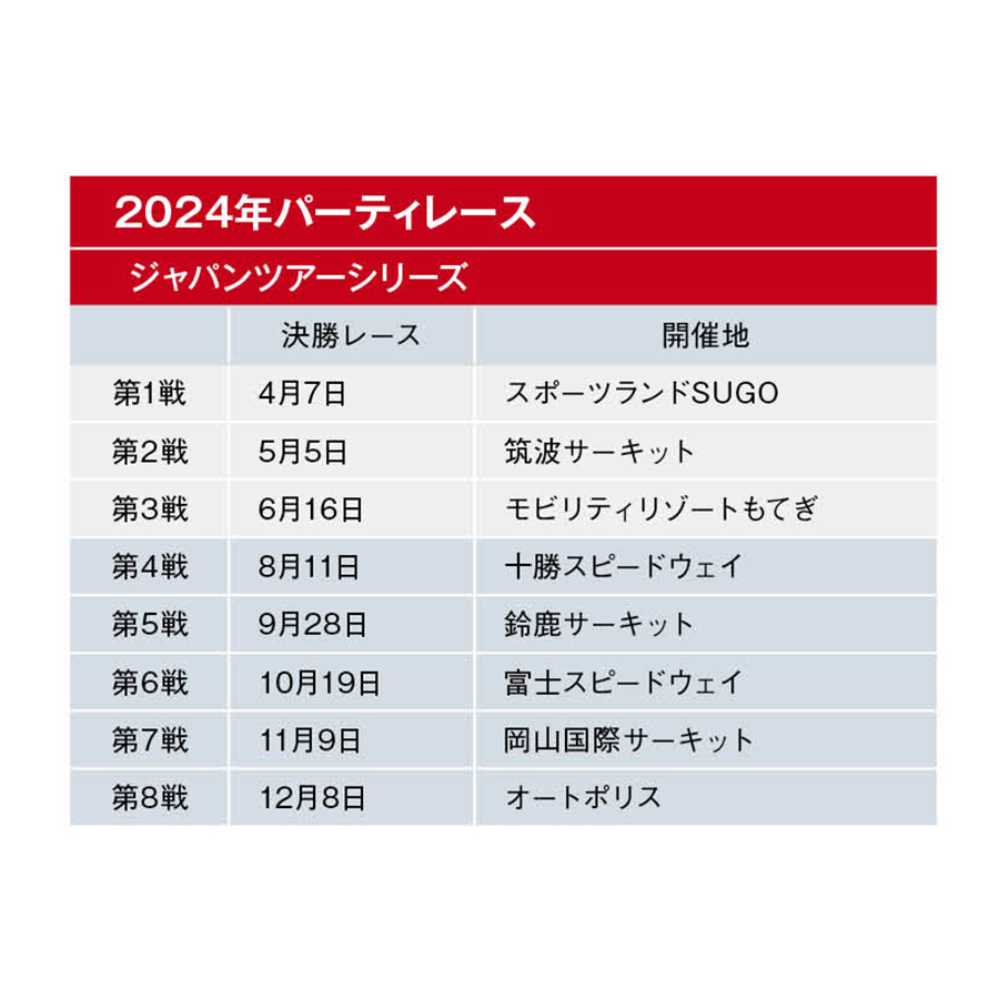 ロードスター・パーティレースの場合は、先の2シリーズと同様に北海道から九州まで転戦するジャパンツアー・シリーズを設定するとともに、スポーツランドSUGO、筑波サーキット、岡山国際サーキットだけで開催するエリアシリーズを開催している点が特徴だ。エリアシリーズの1戦はジャパンツアー・シリーズを同時開催となる。