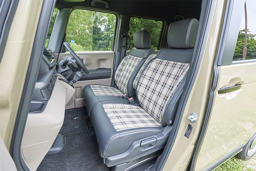 もちろん生地は撥水加工済み。座面、背もたれ、後席背面、スライドボード上面に施されています。そもそもこのチェック柄も、汚れが目立ちにくいベージュに、補色関係にあるオレンジやブルーの色糸をミックスし、落ち着いた色合いに仕上げたということですから、すべて計算ずくのトータルコーディネートなんですよね。