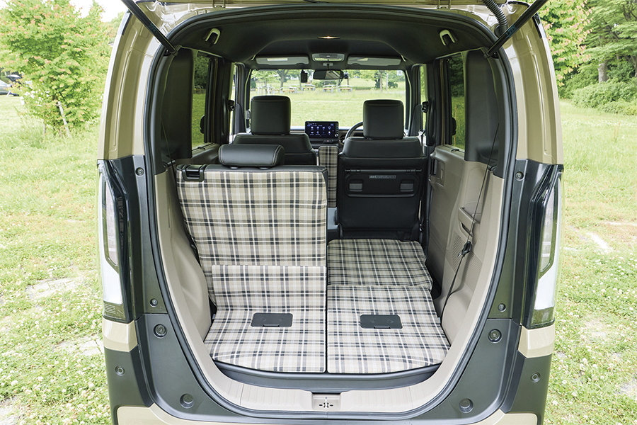 面白いのはシートアレンジした時の快適性にこだわった点。最初から後席を前に倒した前提でのこだわりを盛り込んでいるんです。たとえばN-BOXは、シートを前に倒したときにラゲッジスペースとの間に大きめの段差ができてしまっていたのですが、座面を80㎜上げる工夫で極力段差を少なくし、さらに後席の背面にプレートを入れるアイデアで凸凹を削減。フロアのストラップ機構にもヒンジ式のリッドを設けることで凸凹をなくすなど、広くてフラットなフロアで快適にくつろぐことを想定して作られているんです。