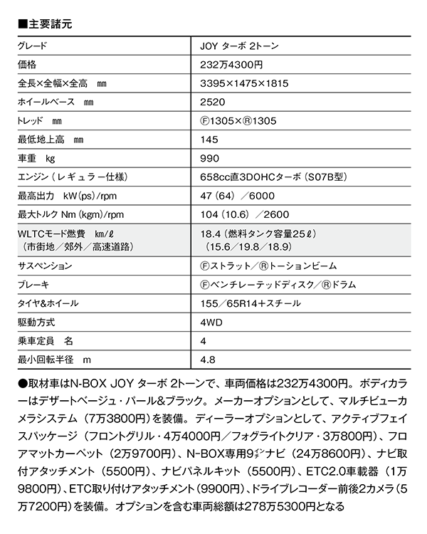 当然のことながら、このカテゴリーは各社からリリースされておりまして、スズキ・スペーシアギア、ダイハツ・タントファンクロス、三菱デリカミニと、いずれも人気を博してまして、ホンダのN-BOX JOYは、現在のところの最後発としての登場となっています。いずれもギア感とか、たくましさとか、楽しさなどをアピールしている感じが伝わってきますが、N-BOXの場合はもはやそのまんまの“JOY(ジョイ)”。このクルマの楽しさ、このクルマを使った喜びをメインに押し出してきたわけです。