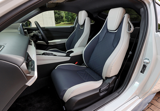 インテリアデザイナーの東森裕生氏は「ダイナミックな走りに対し、コーナリング時など踏ん張りどころでピタッと収まるフィット感を追求しました。ドライバーだけでなく同乗者の快適性も重視しました」と説明。前席は、それぞれが専用仕様の特別設計。運転席はサイドサポートにワイヤーを配し、クッションはやや固め。一方、助手席はワイヤーレスの快適仕様。座面は乗降性を重視した作りである。