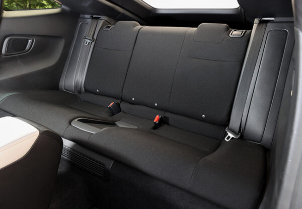パッケージングは2+2構成。後席はいざとなれば大人の乗り込みも可能だ。シートバックを倒すと、ゴルフバッグが2セット積める。