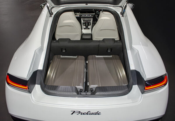 ライトグラフィックは前後ともワイドな一文字形状で、ルーフラインはスムーズ。ボディタイプはリアに大型ゲートを配したプレリュード初の3ドア。足元には19インチの大径タイヤとノイズリデューション形状アルミを組み合わせている。リアセンターに配置された「Prelude」のロゴは、あのアイルトン・セナ選手がCMでドライビングを披露した4代目モデルのオマージュだ。なお、ボディサイズは4520×1880×1355mm。シビック・タイプR比で75mm短く、10mmタイト、50mm低い。ホイールベースは2605mm。クーペとしては長めだが、それでもシビック比で130mm短くなっている。