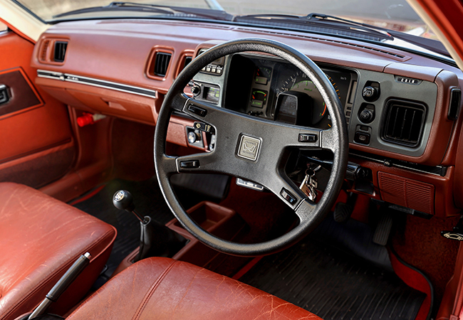 初代は何だかアメリカ車的なイメージを思わせるデザインだと感じました。1978年登場ですが、この頃まだ日本人の「良いクルマ」のイメージがアメリカ車にあったのだなと思います。全体的に角ばっていて、実際のサイズよりも大きな印象を感じるスタイリングと、ヘッドライト周りまで取り囲むメッキが印象的なグリルが、USAを感じさせます。サンルーフやコノリーレザーシートなど時代を超える豪華装備も必見でした。