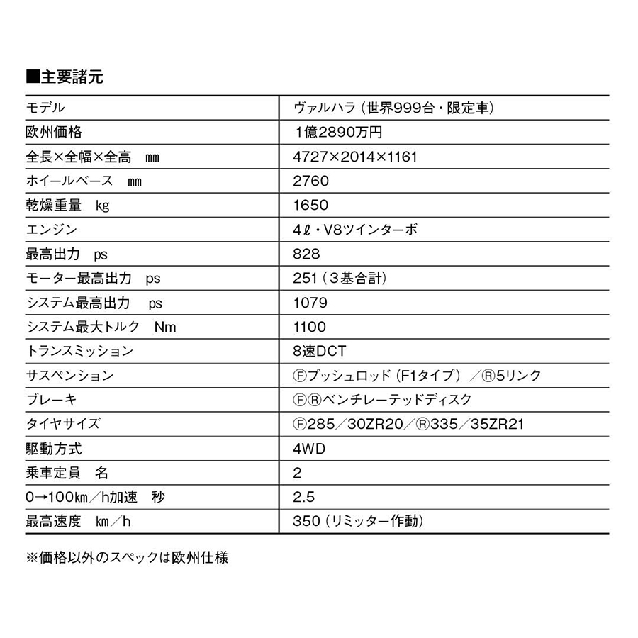 アストンマーティン・ヴァルハラは、ヴァルハラはアストンマーティン唯一の量産ミッドシップ車であり、PHEVスポーツ。生産台数は世界限定999台。3基のモーターと4リッター・V8ツインターボのシステム出力/トルクは1079ps/1100Nmと圧倒的