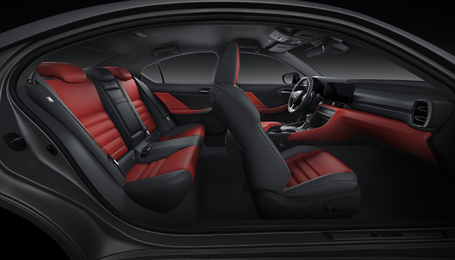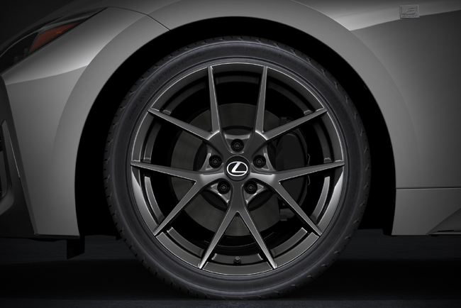 エクステリアについては、ISらしいアグレッシブさをいっそう突き詰めたことが訴求点だ。フロントフェイスは、ブレーキダクトを取り込み低く構えた新スピンドルグリルを採用して、低重心かつワイドなスタンスをさらに強調。また、“F SPORT”には空力性能を強化した新形状のリアスポイラーを装備し、床下から車両背面へ巻き上がる空気の流れを増加させることで、リアの揚力を低減し、より優れた空力操安性能を実現する。ボディカラーには、スポーティに駆け抜けるような走りの世界観を表現した新色のニュートリノグレーを加えた計8色をラインアップした。さらに、足回りではアルミホイールの意匠を一新。IS350/IS300h“F SPORT”には新意匠の19インチ軽量アルミホイールを組み込み、細軸スポークのタイトなデザインにグロスブラックメタリックを施して、優れた運動性能をより際立たせる。メーカーオプションとして、LEXUSロゴ入りのレッドブレーキキャリパーも設定した。一方、IS350/IS300h“version L”には従来のシャインシルバーメタリックからダーククリア塗装+切削光輝へと刷新した19インチアルミホイールを装着。グロスブラックをベースに切削光輝処理を施し、スモーククリアを塗布することで、より引き締まった足元を演出する。そしてIS350/IS300hには、従来のシルバーメタリックからダークプレミアムメタリックへと塗装色を変更した18インチアルミホイールを配備。奥行感とスポークの立体感により、タイト&スポーティなイメージをより強調した。ボディサイズは従来比で10mm長く、それ以外は同寸の全長4720×全幅1840×全高1435(2WD)~1440(AWD)mm、ホイールベース2800mmに設定している。