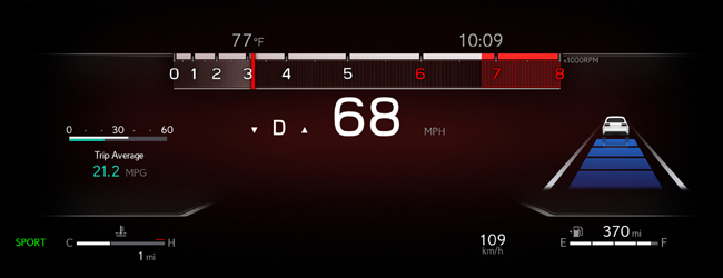 インテリアカラーについては、新規開発色の“PROMINENCE(プロミネンス)”を新たに設定。太陽を覆う神秘的な紅炎をイメージした彩度の高いカラーが、室内のアグレッシブでスポーティなイメージをいっそう強調する。また、インストルメントパネル中段部には運転時の邪魔にならない水平基調のラインイルミネーションを配置し、そこから漏れる間接光で室内空間に彩りを加えた。照明の色は美しい自然現象などから着想した計14色のテーマカラーに加えて、ユーザーの好みに合わせて選べる50色のカスタムカラーを設定している。