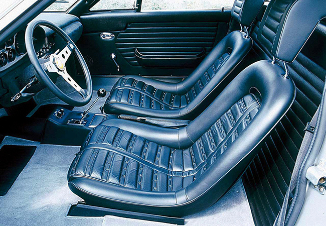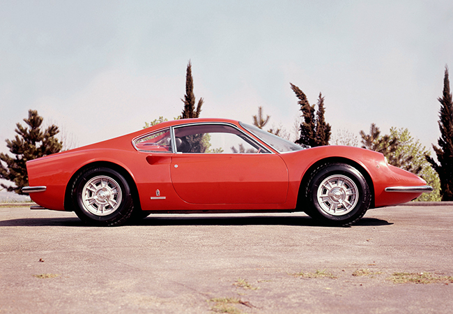 ディーノ246GT。1969年に登場した2.4リッターユニットを積む246は美しいスタイリングはそのままに前身の206比でホイールベースを60mm、全長は110mm拡大。ボディパネルをアルミからスチールに変更して生産性に配慮していた
