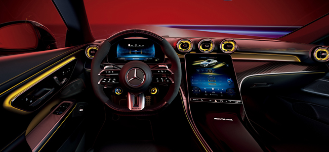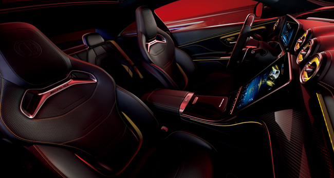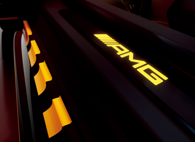 インテリアについては、ブラックの内装色とAMGカーボンファイバーインテリアトリムを基調にイエローのアクセントを随所に配して、スポーティネスとスペシャル感を高度に調和させたことがトピック。シートにはイエローのステッチを入れたAMGナッパレザー表皮のAMGパフォーマンスシートを装着し、シートベルトもイエローで仕立てる。また、限定車専用インドアカーカバーやAMGパフォーマンスステアリング(カーボンファイバー/MICROCUT)などを特別装備した。機能装備としてマルチコントロールシートバック(運転席・助手席)やシートベンチレーター(シートヒーター機能含む)(運転席・助手席)、エアバランスパッケージなどを組み込んで、乗員の快適性を高めたことも本限定車の訴求点である。
