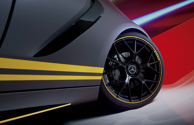 まずエクステリアについては、人気ボディカラーのMANUFAKTURグラファイトグレーマグノ(マット)を纏ったうえで、専用デカールをはじめとするイエローアクセントや本モデル限定装備のAMGナイトパッケージおよびAMGエクステリアナイトパッケージⅡを採用。多数のパーツがカーボン素材やブラックカラー、ダーククロームに換装され、よりレーシーで引き締まったルックスを創出する。また、AMGスタイリングパッケージを配備して、フロントおよびリアに追加のフリックを、リアエプロンにディフューザーパネルを装着。さらに、AMGカーボンファイバードアミラーやAMGカーボンファイバースポイラーリップ、20インチAMG鍛造アルミホイール(RVQ)を特別装備した。乗員の開放感を高めるパノラミックスライディングルーフも標準で採用している。