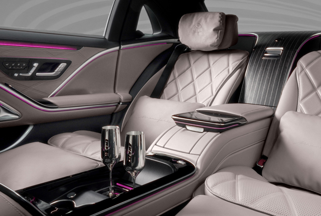 インテリアについては、MANUFAKTURローズグレー/ブラック(ナッパレザー)の内装色およびシートに、MANUFAKTURダークブラウンオープンポアウォールナットウッドインテリアトリムやMANUFAKTURナッパレザールーフライナー、マイバッハパターン入りセンタートリム、ナイトシリーズ専用イルミネーテッドステップカバーなどを装備して、瀟洒かつラグジュアリーなキャビン空間を創出。また、後席には左右独立シートと格納式テーブルを採用し、シャンパングラスも付属する。さらに、機能装備としてクーリングボックスやBrumesterハイエンド4Dサラウンドサウンドシステムを配備。ほかにも、タイヤフィットやナイトシリーズ専用キーなどを装備している。