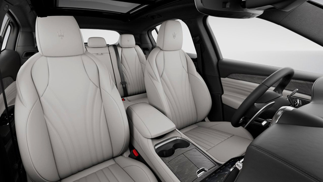 まずボディカラーには、ピュアホワイトの“ビアンコ”を採用。開放感を高めるパノラマサンルーフや20インチ エテレ鍛造アロイホイール+サマータイヤも標準で装備する。グレカーレをベースにしたモデルには、リアプライバシーガラスも装着した。一方で内装には、アイボリーホワイトの“ギアッチョ”のインテリアカラーを採用。合わせて、スマートパック(フロントシートベンチレーション、リアシートヒーター)を標準で組み込む。グレカーレをベースにしたモデルには、3ゾーンクライメートコントロールも配備した。