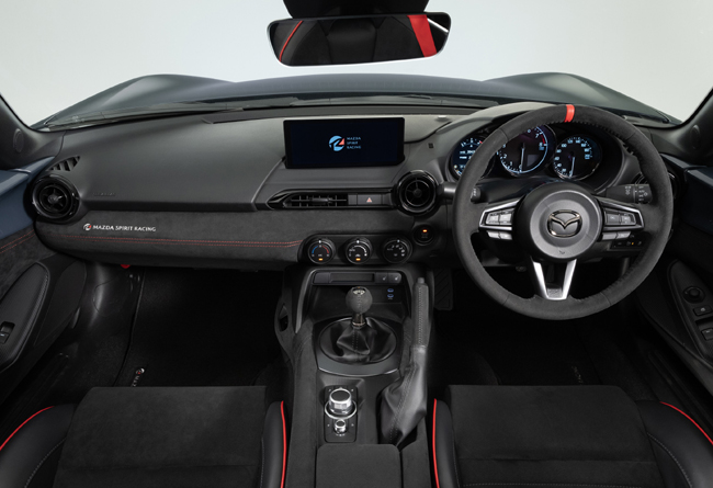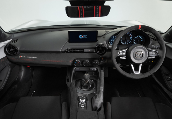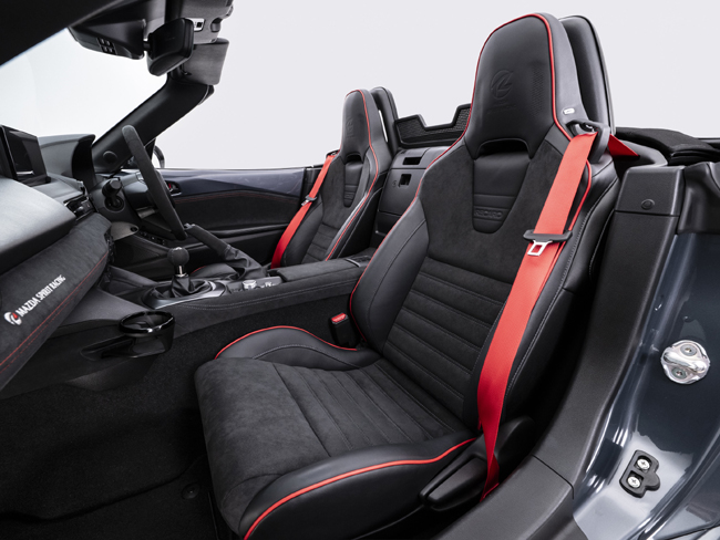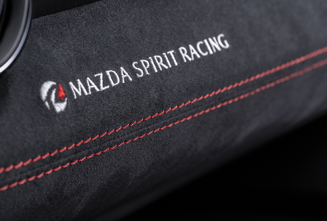 シートについては、レカロ社と共同開発したセミバケットシートを装着。ヘッドレスト部にはエンボス加工による“MAZDA SPIRIT RACING”ロゴをあしらい、合わせてシート外周にはレッドパイピングを施すことでレーシーな雰囲気を生成する。ナッパレザーとアルカンターラのコンビネーション表皮により、上質な質感も実現した。