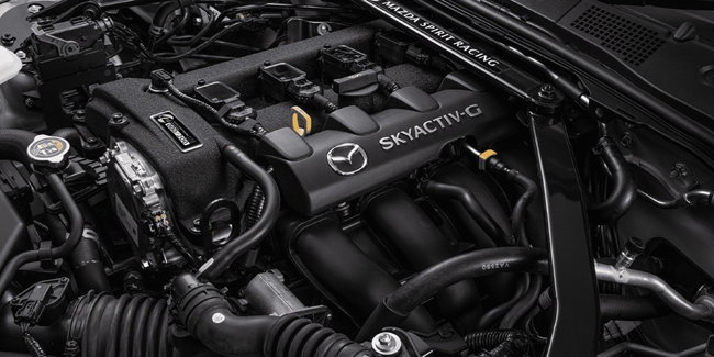 ▲4代目ロードスターの国内仕様ソフトトップモデルでは初となる、SKYACITV-G 2.0(PE-VPR[RS]型1997cc直列4気筒DOHC)エンジンを搭載したうえで、アクセル反応の最適化やヒールアンドトゥアシスト機能の採用、スピードリミッター解除、レブリミット制御変更などを実施する