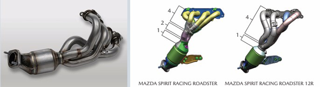 一方でMAZDA SPIRIT RACING ROADSTER 12Rは、サーキット走行を存分に楽しむための技術や装備を搭載したメーカーコンプリートモデルとして企画する。パワートレインについては、SKYACITV-G 2.0エンジンの吸気ポート形状の変更と、匠エンジニアの手作業による吸気ポート内側研磨による空気抵抗吸入空気量の増加を行って、出力とレスポンスを向上。S耐参戦のMAZDA SPIRIT RACING RS Future conceptと同じ低抵抗のピストンとピストンリングも組み込み、ピストンリングには低摩擦係数と高い硬度を併せ持つDLC(ダイアモンド・ライク・カーボン)被膜を導入する。エンジンヘッドカバーには手塗りの結晶塗装(ブラック)を施し、シリアルナンバープレートも設置した。エンジン型式はPE-VPR[RS-R]を名乗り、最高出力は200ps/7200rpm、最大トルクは21.9kg・m/4700rpmにまで高める。また、フレッシュエアダクトの大型化やカム形状の変更、サーモスタット開弁タイミング(冷却開始タイミング)の早期化も実施した。さらに、エキゾーストマニホールドを藤壺技研工業と共同開発。既存の4-2-1排気から4-1排気化し、合わせて4本のパイプの長さを統一するとともに径を拡大。耐久性、遮熱・防音性能を省スペースで実現する目的で、ガラス繊維のバンテージとステンレスメッシュも採用する。ほかにも、既存のデュアルマスフライホイールからシングルマスフライホイールに変更して、ダイレクトなトルク伝達と高負荷使用での耐久性を引き上げた。